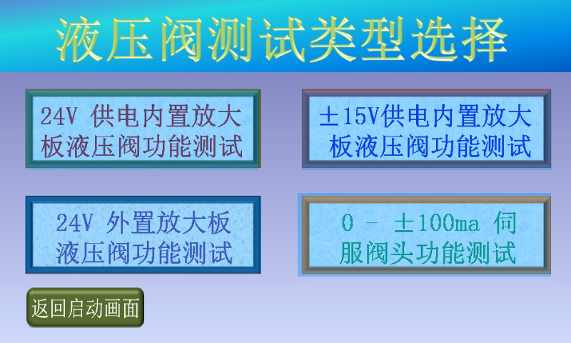 3、確認(rèn)現(xiàn)場人員和設(shè)備安全后,點(diǎn)擊“進(jìn)入測試”,進(jìn)入液壓閥測試類型選擇畫面;